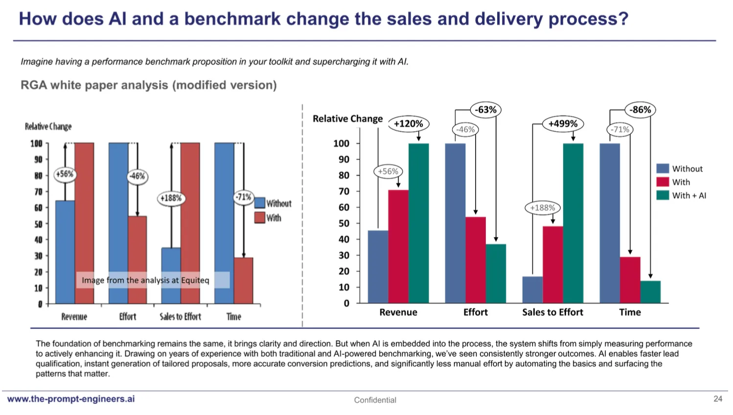 This mirrors what professional consulting firms are already experiencing. Based on years of deploying benchmarking propositions and now AI-enhanced versions, the outcomes are markedly stronger. With AI in the mix, teams can identify and qualify leads in a streamlined fashion , generate tailored proposals in minutes, predict conversion likelihood with greater accuracy, and eliminate a huge amount of repetitive pre-sales work. The fundamentals of selling become more efficient, leaving consultants focused on genuine insight and stakeholder change. Put simply: more business, less effort, a fraction of the time. And when benchmarks dynamically update across a portfolio of clients, the benefits multiply again - AI becomes the engine doing the work, not just the judgement layer. The re-analysis of Equiteq’s white paper in the book quantifies the same as shown in the figure below.